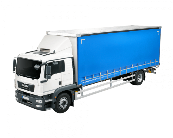 18-tonne rigid curtainside truck with blue curtains